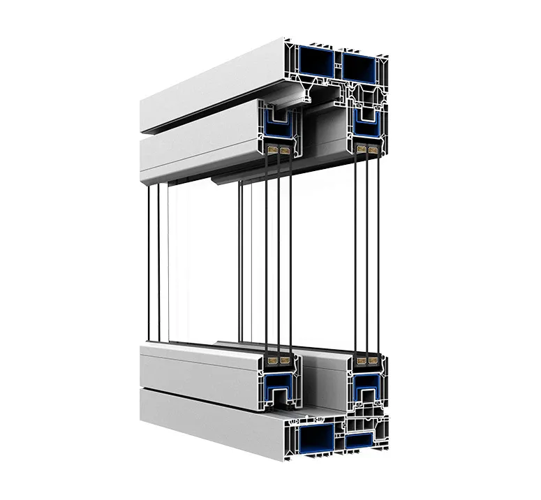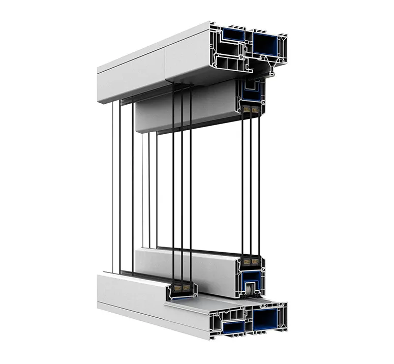 - Profils PVC à 7 chambres ou aluminium avec rupture thermique, épais de 82 mm, assurant une excellente isolation thermique et une grande robustesse face aux intempéries.