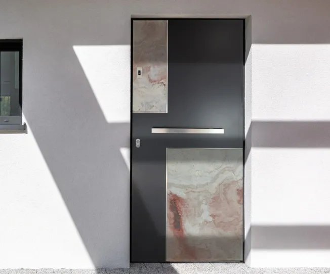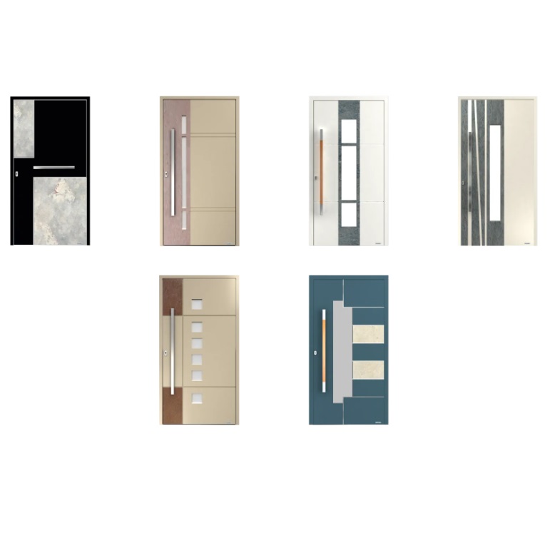- Détails uniques et inspiration naturelle : Portes combinant panneaux opaques ou vitrages, avec des décors en pierre naturelle, inox ou bois pour un style singulier.